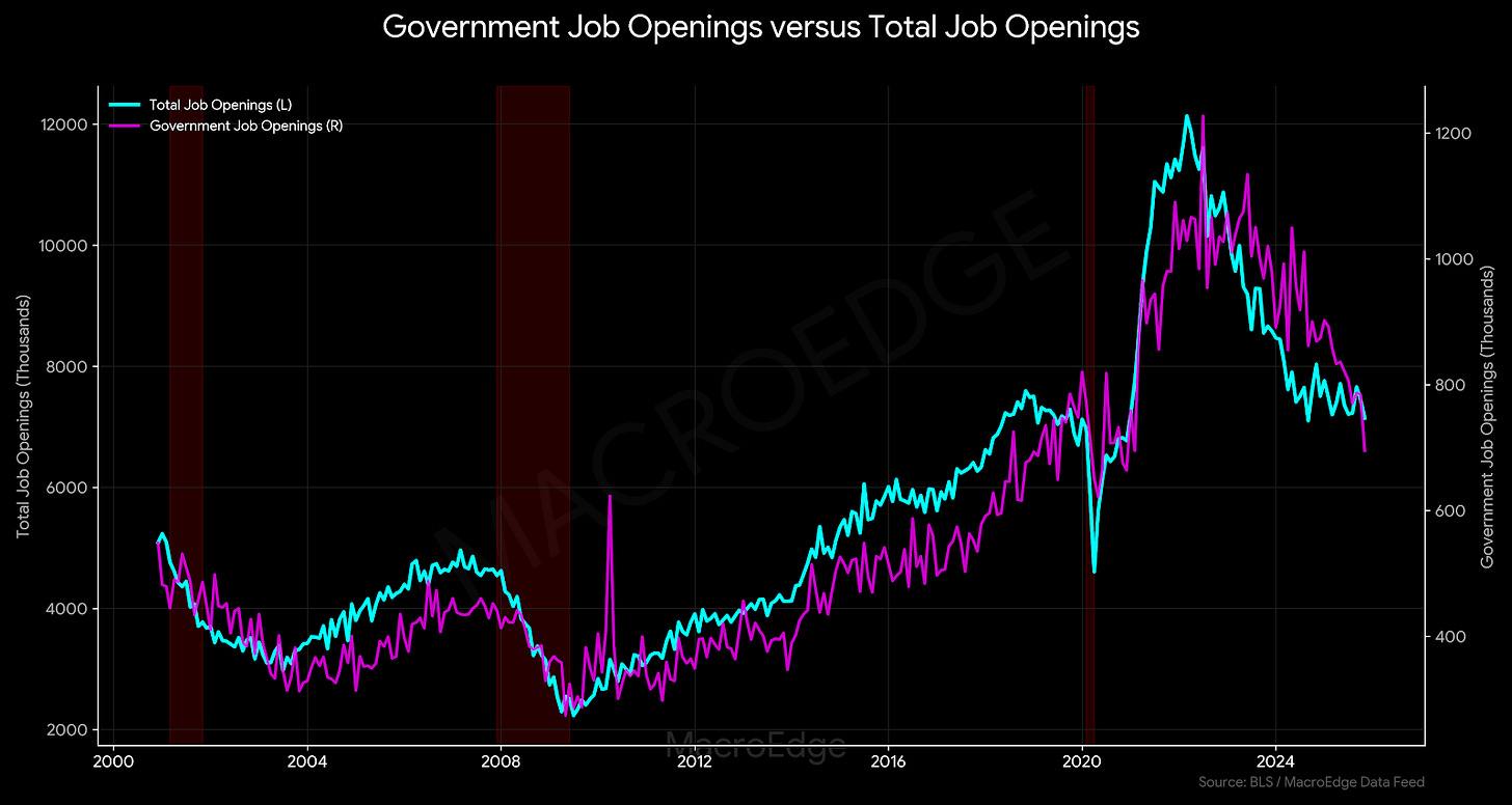 The biggest dip was in government job openings, which has been one of the last to break lower. The federal hiring freeze remains in place (outside of national security functions) though state and local openings still haven’t bled lower as we need to see government job openings below 600K.
