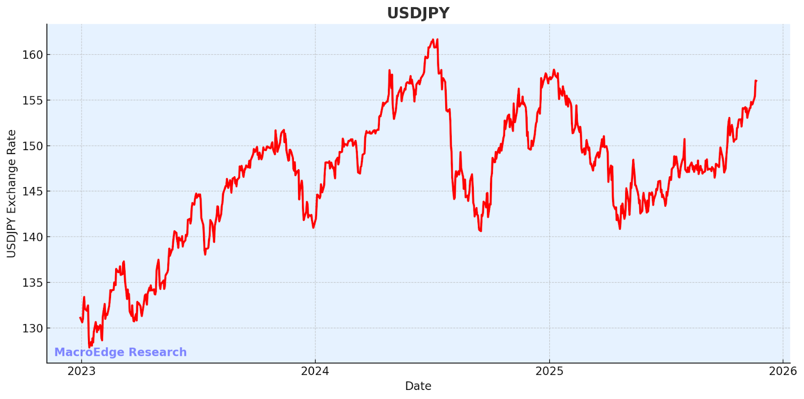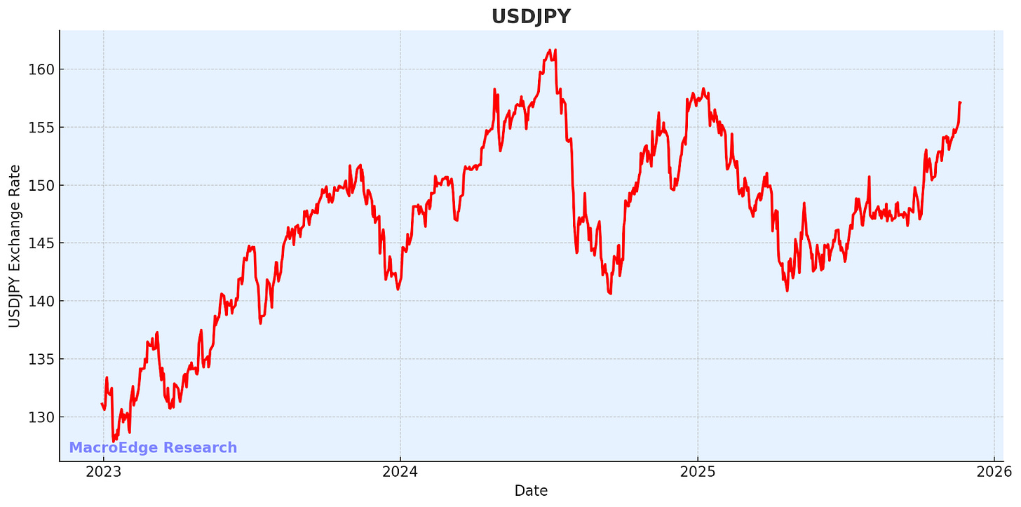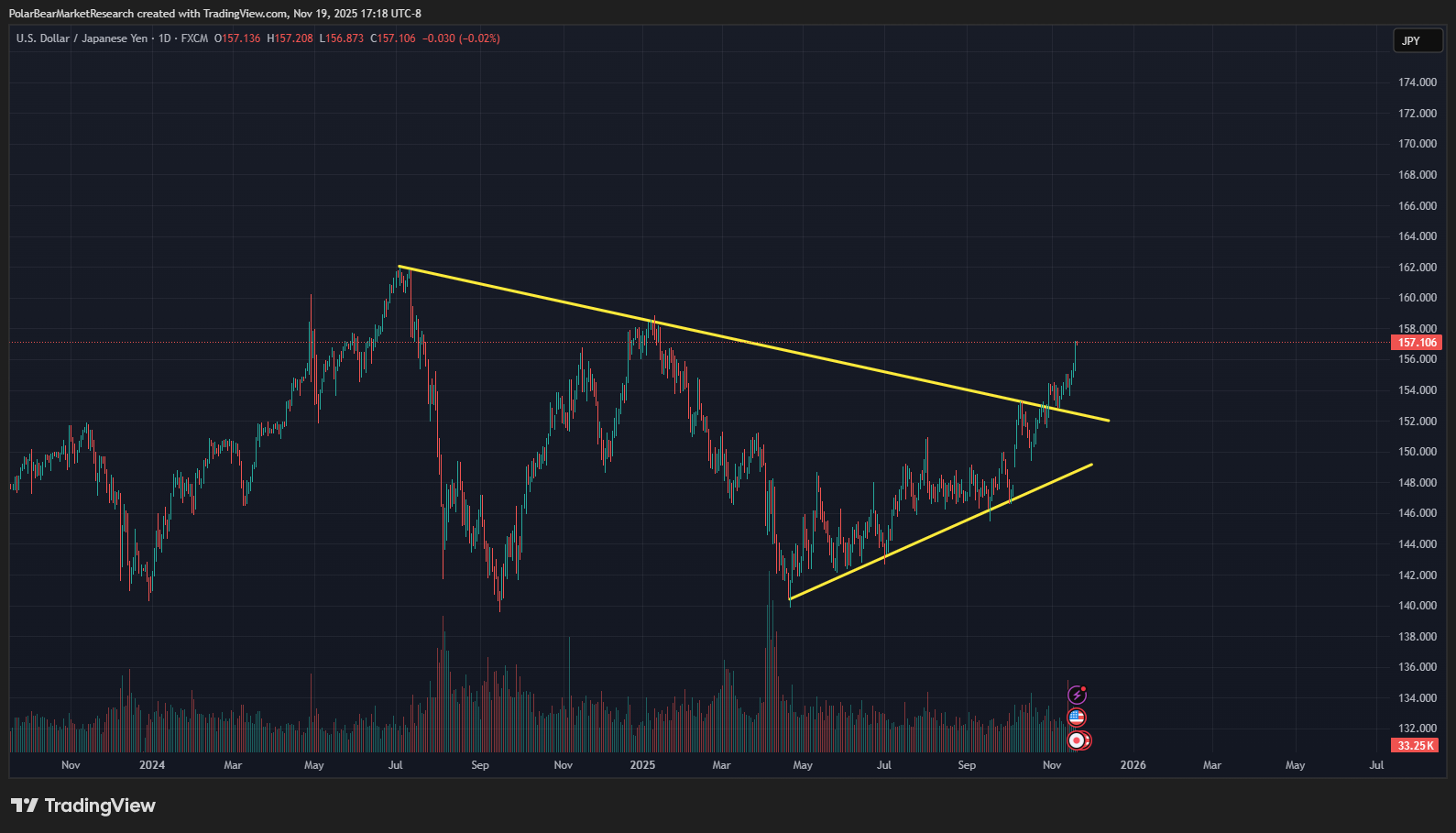 Back in late September, I covered the over-bearishness on the dollar, and we’re now seeing the dollar rally gain some steam. This has been most noticeable against the Yen, which weakened below 157 today. Given the blowout in yields in Japan, alongside the newly elected PM watching their currency smolder (remember - Bessent’s goal?), I think an intervention is back in the cards in the 160 - 170 level. With the recharging of the Carry Trade, a reversal and strengthening of the pair (notably from the Yen) will be risk off for US tech equities.