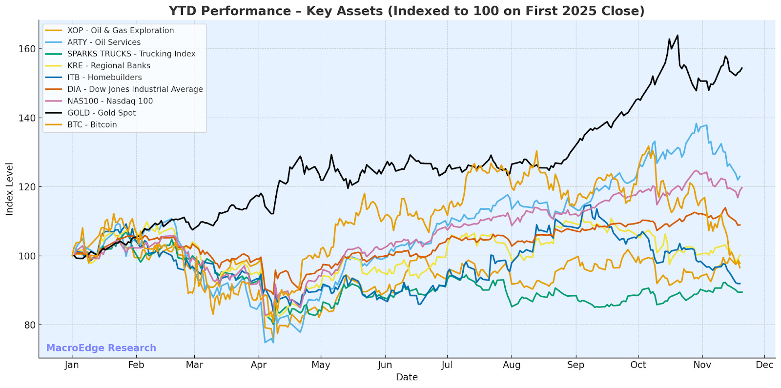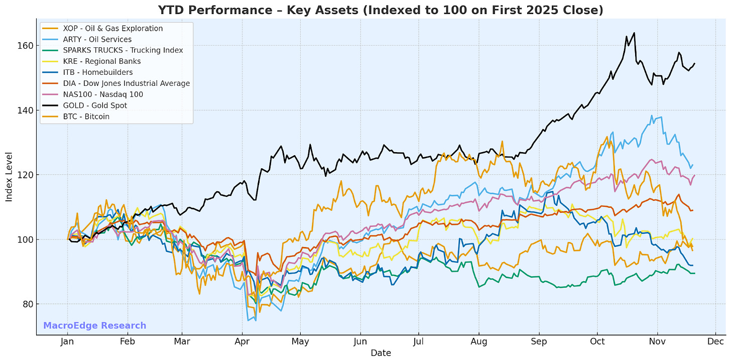 Overall, the broader thematic continues to be one of distribution & sideways action when one zooms out. Performance in the Dow has been rather lackluster given its lack of AI shine, while the Nasdaq has remained substantially more positive on the year, along with SPX. Lots of major sectors and thematics have struggled, such as homebuilders & airlines, have struggled this year versus the AI names (charted below is the AI thematic versus the real economy thematic). One of the worst performers of the year has been Bitcoin: