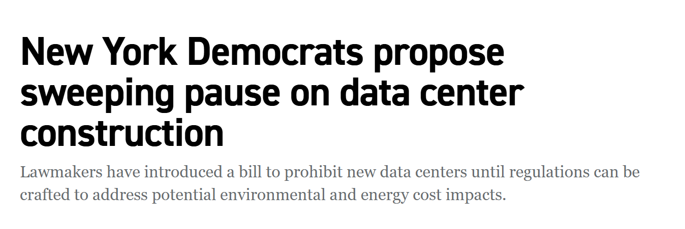 This environment has come under more pressure in the United States - and I expect that it will get even more difficult through the year for things like the AI/data center trade as new regulations, postponements, and ground-up efforts to stop the massive construction pipeline get underway. Below, we’re going to cover the latest developments through the beginning of the month, and in three weeks we’ll have the second update for the month of February. Six states now have active bills to be voted on that will serve as outright bans on the construction of new data centers - some with multi-year windows… like the bill in New York introduced yesterday that calls for a 36-month moratorium on new construction: