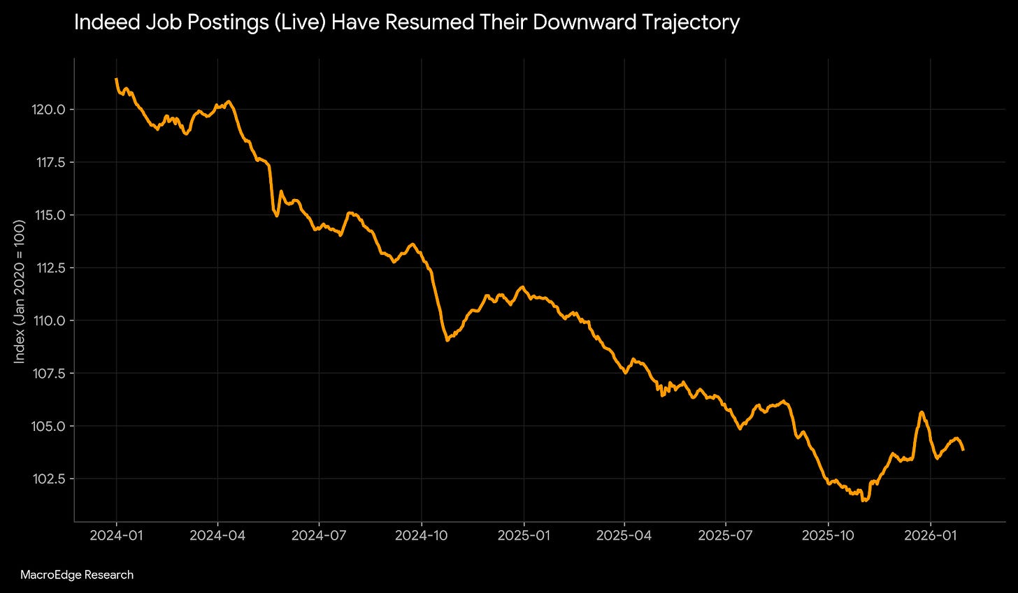 Indeed Job Postings (live) have resumed their downward trajectory after a brief seasonal bounce: